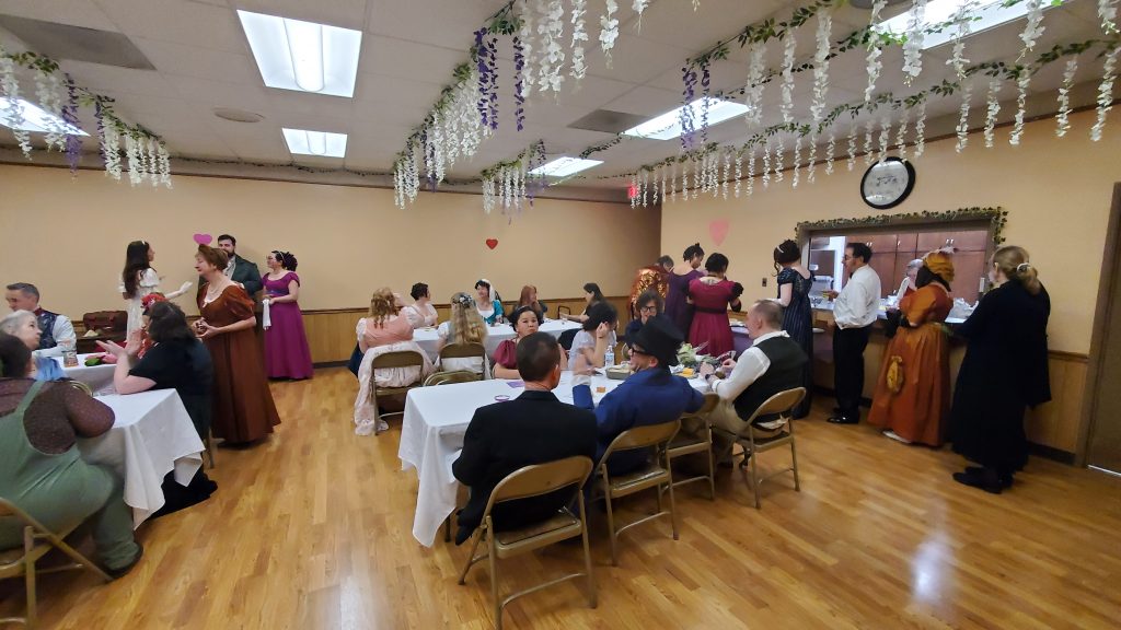 This was the first of these balls which hasn’t sold out, and there were people who’d been to the previous three who weren’t there. I don’t know if there was something going on in an overlapping community that took them away, whether the Playford workshop tired people out, etc – but I did notice that unlike last time, we had at least one set of Roger de Coverley that couldn’t self-organize and I had to walk through and prompt, so I think there were significantly fewer PEERS/Fezzi’s/Gaskell people. I was told that the recent heavy rains had hindered the Odd Fellows efforts at flyer posting / postcard distribution – so it’s hard to tell whether this is a blip. Anyway, 50 signups, which was enough to be having fun. I call without gender reference and say anyone can ask anyone to dance and anyone can line up on any side.