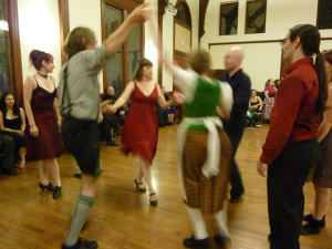 Irish Ceili (pronounced KAY-lee) is one of three forms of Irish dancing. It is done in groups and at parties (unlike the solo Irish step dancing). Those jigs and reels that have you tapping your foot were made for dancing! Dances are similar to English country dances seen at Regency dance events, but done to the lively music of Ireland. They’re often done in long-ways sets or sets with 4, 6, or 8 dancers. The Irish also love to waltz, so waltzes are done between set dances.